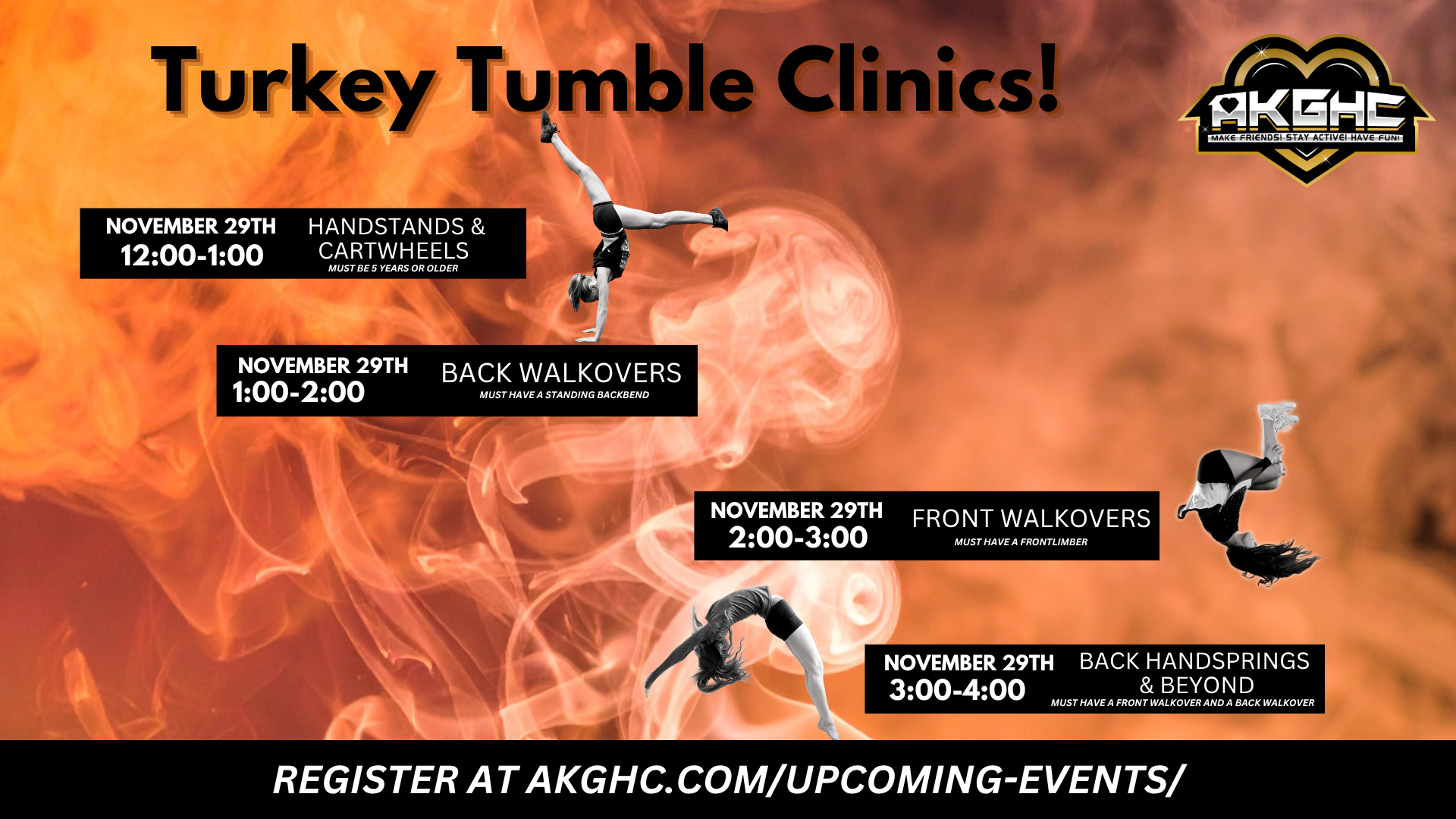 Join us on November 29th for a day packed with handstands, cartwheels, walkovers, back handsprings and more!