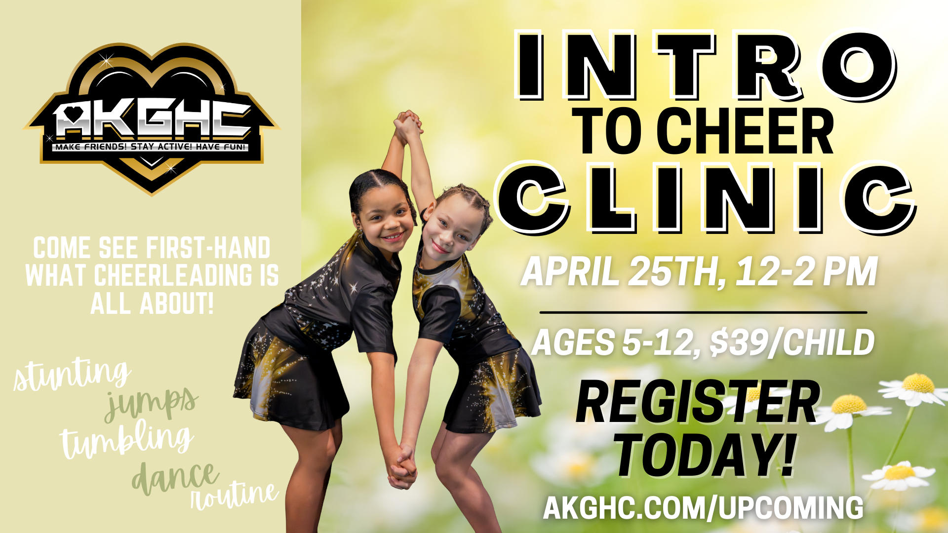 Curious about cheer? This is the perfect place to start! At our Intro to Cheer Camp, kids will get a fun, confidence-boosting taste of what cheer at AKGHC is all...